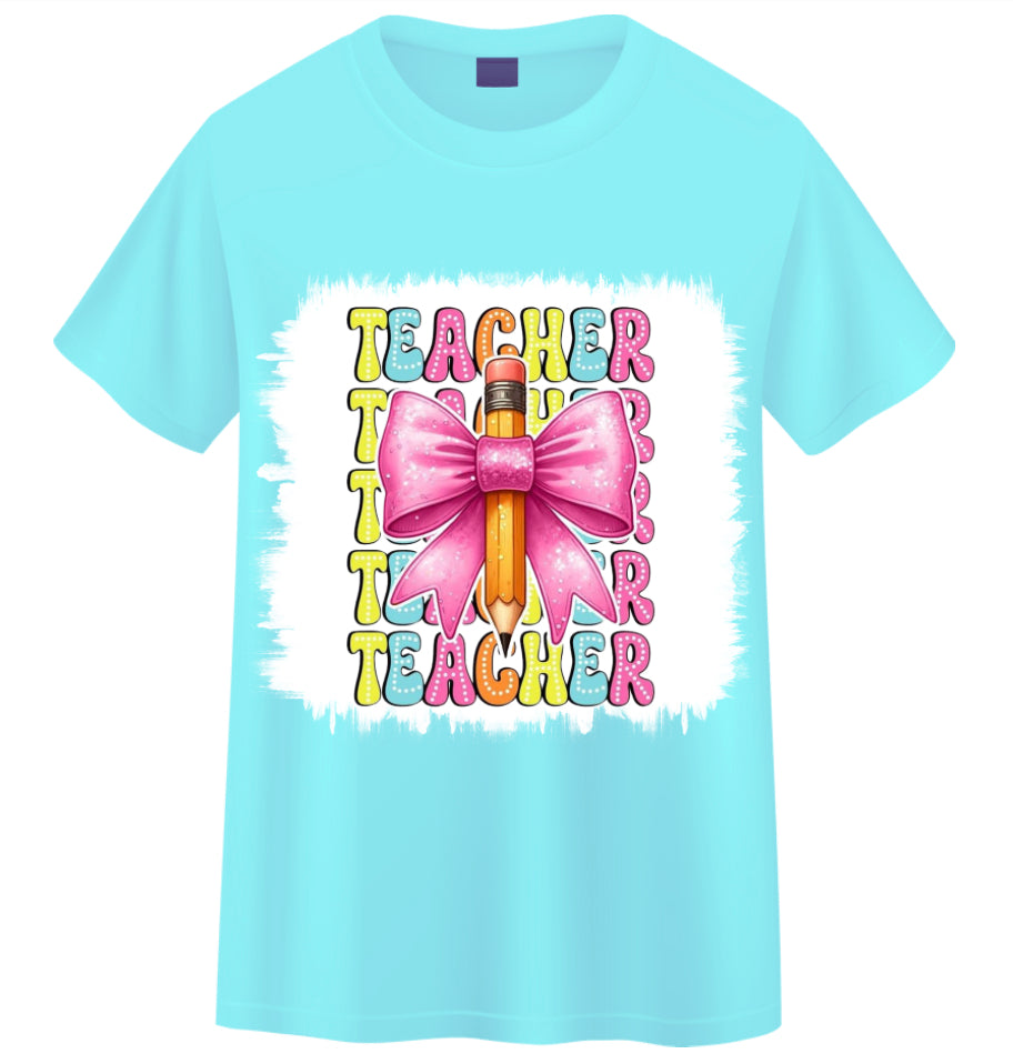 Faux bleached tee 100% polyester. Teacher design with cute pencil bow Expertly designed and crafted with faux bleached 100% polyester, this teacher tee is a must-have for educators. Featuring a charming pencil bow design, this top is sure to make a statement in the classroom or during any school event. Breathable and durable, it delivers all-day comfort so you can focus on what matters most - shaping the minds of the future.