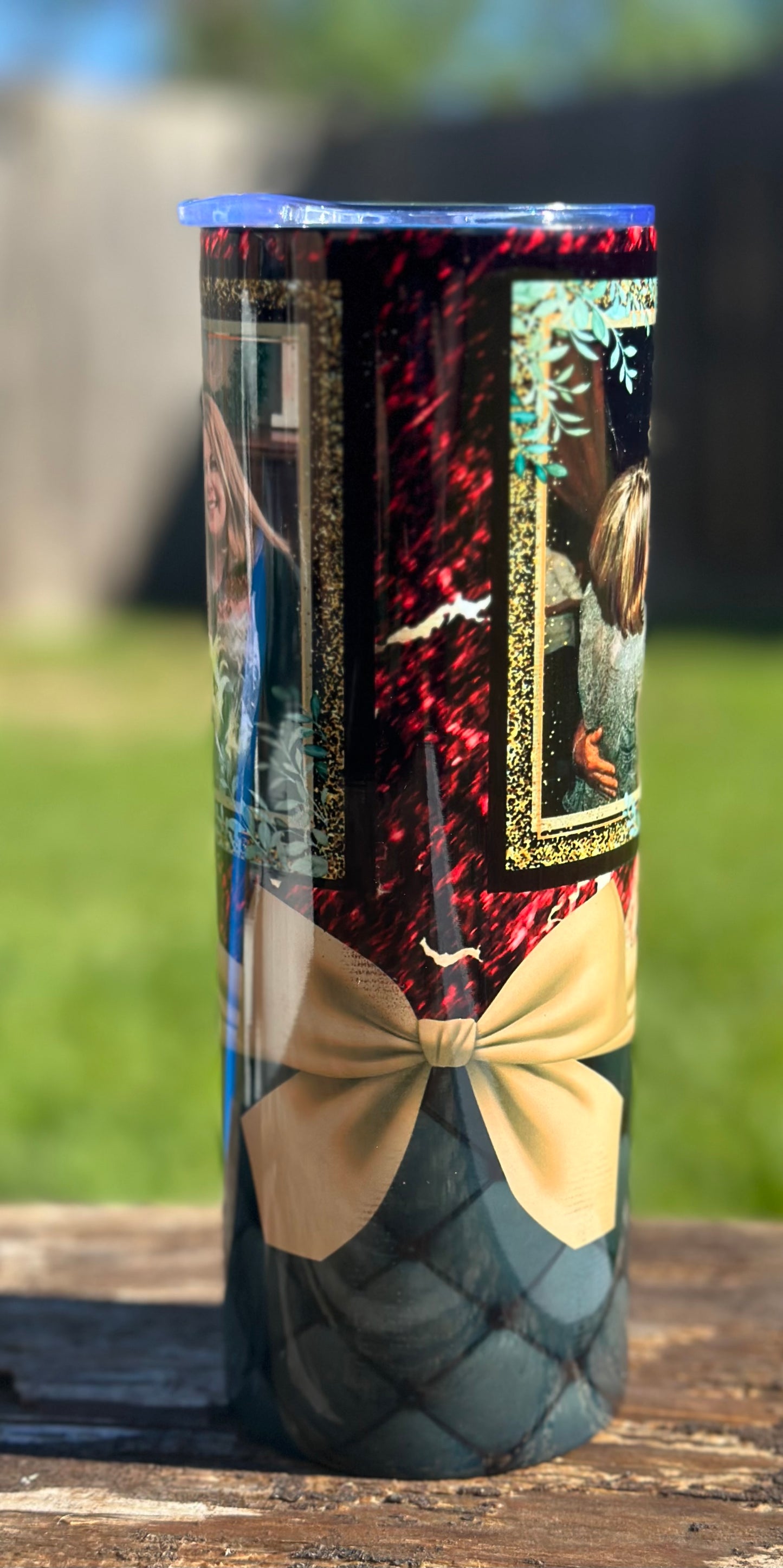 This personalized tumbler features a beautiful red gradient background and decorative bow and can hold up to 2 photos, making it the perfect gift for any occasion. The custom design adds a personal touch, while the tumbler itself provides a functional and stylish way to enjoy your favorite drinks on the go.