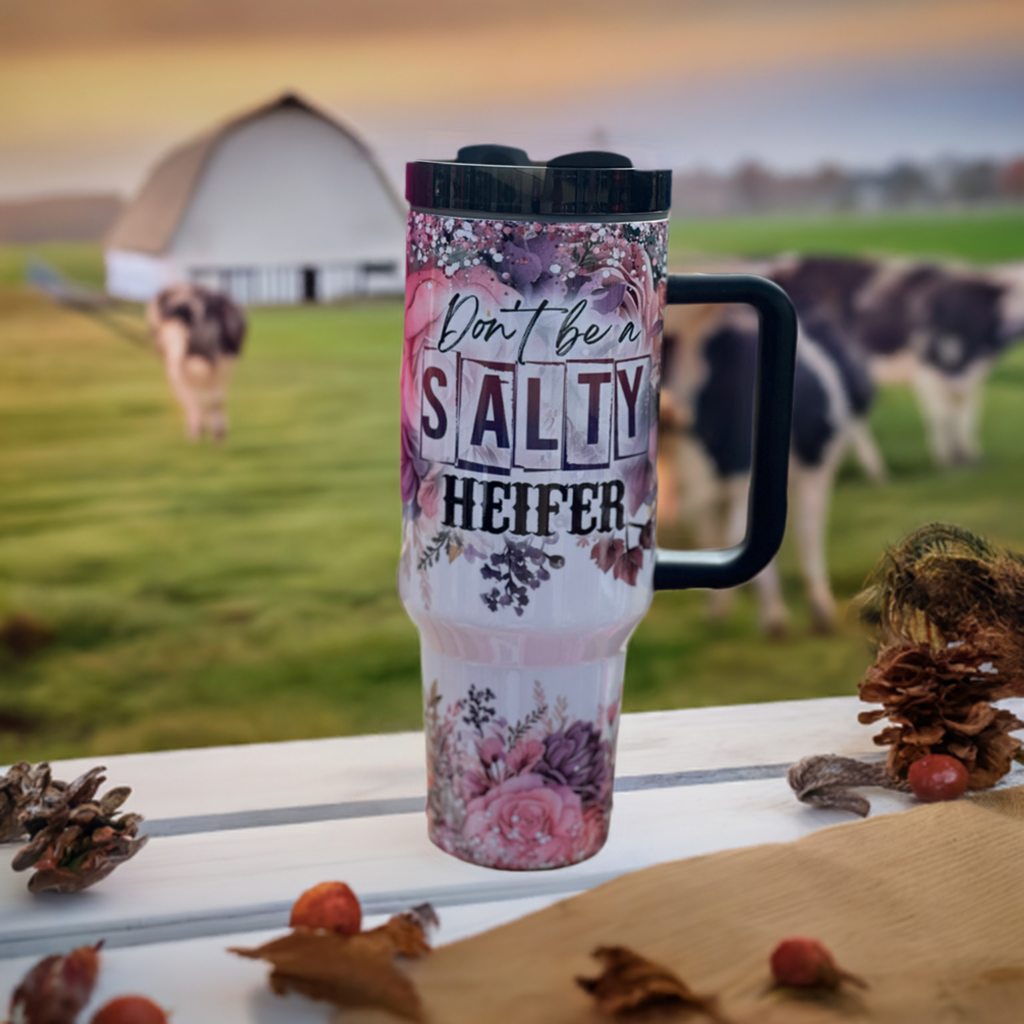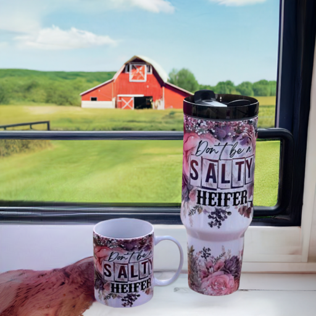 Experience superior hydration on-the-go with our Don't be a salter heifer tumbler or bundle mug and tumbler. With a 40oz capacity, this tumbler is perfect for keeping your drinks at the desired temperature for longer periods of time. Stay refreshed and hydrated wherever you go with our high-quality, portable tumbler.
